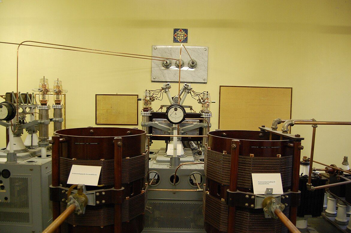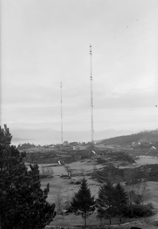 Radiomaster og senderbygning da dette var helt nytt. Antennen fungerer ved at det er trukket en kabel opp midt mellom de to 150 meter høye mastene og koblet sammen med en annen kabel som er spent 195 meter mellom toppen av mastene. Dette danner en T og det er T-en som er antennen, ikke mastene i seg selv. Antennens jordingsnett med ca 100 nedgravde kobbertråder er lagt som stråler radialt ut fra bygningen. I dag er mastene demontert, men bygget står.Atelier KK mellom 1937 og 1939. Fotosamlingen marcus ved UiB